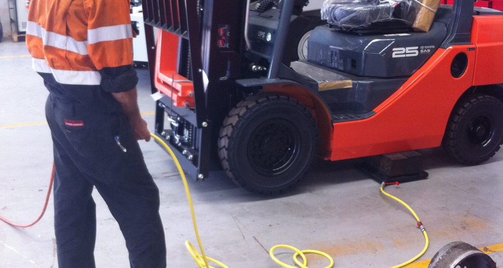 On many of the forklifts the cast iron body castings have a large radius making it unsafe to use a typical toe jack. As all the service vehicles already had air compressors on board the power source for the air bags was already available.