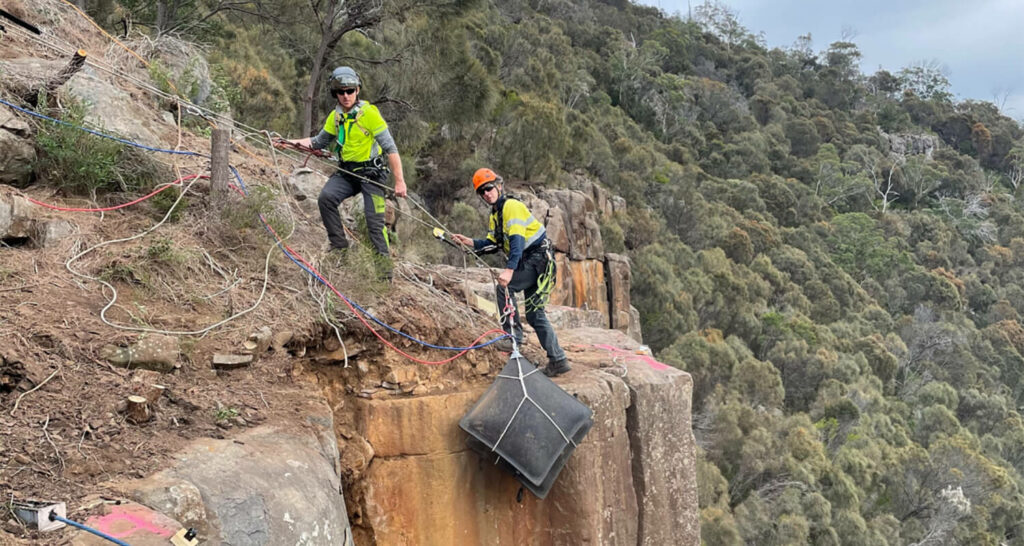 Within 23 hours of the order being placed, the airbags were Heli-Lifted from Brisbane to the top of the cliff in Tasmania. The airbags were then abseiled down to the rocks.