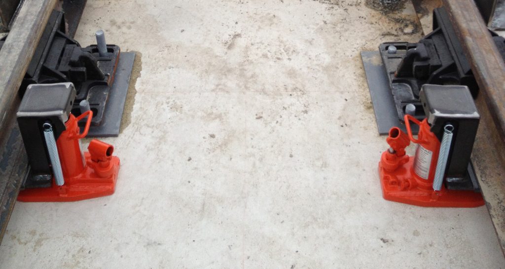 A rail contractor needed to assemble insulated track panels prior to installation of new track in tunnels. 24 x Durapac DTJ-2.5 (2.5 tonne capacity) toe jacks were used lift and lower the rails lengths onto the insulated pads so the levels could be set prior to assembly. These toe jacks provided an inexpensive alternative to purchasing track jacks for this purpose.